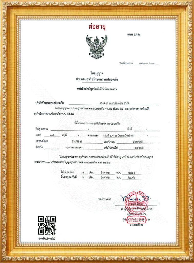 Company history Ranger Investigation Guard Co., Ltd. บริษัทรักษาความปลอดภัย แรงเจอร์ อินเวสติเกชั่น จำกัด "ท่านลองคุยกับเราดู ท่านจะยิ่งเชื่อมั่น... และมั่นใจในที่สุด เมื่อท่านใช้บริการ" บริษัท แรงเจอร์ อินเวสติเกชั่น จำกัด ก่อตั้งขึ้นเมื่อปี พ.ศ. 2535 โดยกลุ่มนักบริหารรักษาความปลอดภัย ซึ่งมีประสบการณ์มาอย่างยาวนานและมุ่งมั่นพัฒนางานรักษาความปลอดภัยให้มีมาตรฐานเป็นที่ยอมรับของสังคมและลูกค้าผู้ใช้บริการทั่วไป บริษัทฯ ตระหนักอยู่เสมอว่า การให้บริการที่ดีจะต้องประกอบด้วยบุคลากรที่มีคุณภาพและเครื่องมืออุปกรณ์ที่ทันสมัย ครบครัน การให้บริการลูกค้าแต่ละราย บริษัทฯ จึงจัดสรรและอบรมพนักงานอย่างเข้มงวดและติดเขี้ยวเล็บทั้งด้านอุปกรณ์และปัญญาให้กับพนักงานจนเชื่อมั่นว่าสามารถเป็นตัวแทนของบริษัทฯ ไปทำหน้าที่ดูแลรักษาความปลอดภัยที่ดีได้ ซื่อสัตย์ มีวินัย เข้มแข็ง ตรงต่อเวลา รู้หน้าที่ มีความรับผิดชอบ หัวขบวนบริหารคุณมนูญ ทองทิพย์ กรรมการผู้จัดการ / ประธานเจ้าหน้าที่บริหาร ถูกต้องตามพระราชบัญญัติธุรกิจรักษาความปลอดภัย พ.ศ.๒๕๕๘ ใบอนุญาตประกอบธุรกิจรักษาความปลอดภัย ตามความในมาตรา ๑๖ แห่งพระราชบัญญัติธุรกิจรักษาความปลอดภัย พ.ศ. ๒๕๕๘ ใบรับการรับรองเป็นสถานฝึกอบรมหลักสูตรรักษาความปลอดภัยตามมาตรา ๓๘ วรรคสอง แห่งพระราชบัญญัติธุรกิจรักษาความปลอดภัย พ.ศ. ๒๕๕๘ Video Presentation วีดีโอนำเสนอ Contact us สนใจบริการ ติดต่อเราทันที! ขอใบเสนอราคา สอบถามข้อมูลเพิ่มเติมติดต่อเราและเราจะตอบกลับท่านโดยเร็วที่สุด ติดต่อเรา วิสัยทัศน์ พันธกิจ ให้บริการด้วยมาตรฐานสากล พร้อมดูแลด้วยคุณธรรม จริยธรรม ทั้งลูกค้าและพนักงานของเราเรามุ่งหวังเสริมสร้างอาชีพอย่างมั่นคงและยั่งยืน ด้วยการฝึกฝนทักษะการปกป้องและช่วยเหลือเพื่อนมนุษย์ เพื่อสร้างสรรค์สังคมที่ดีต่อไป พัฒนาบริการ คัดสรรและอบรมบุคลากรอย่างเข้มงวดเสริมสร้างศักยภาพของบุคลากรและเลือกใช้เทคโนโลยีที่ทันสมัย เพื่อให้มั่นใจได้ว่าเราจะสามารถให้บริการรักษาความปลอดภัยที่ดีที่สุดเสมอ